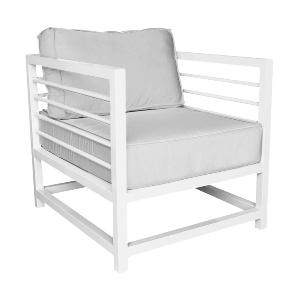 The casually tailored Ash Armchair is generously sized and luxuriously comfortable. A weatherproof aluminum frame with horizontal bar detailing supports ultra-plush back and seat cushions.