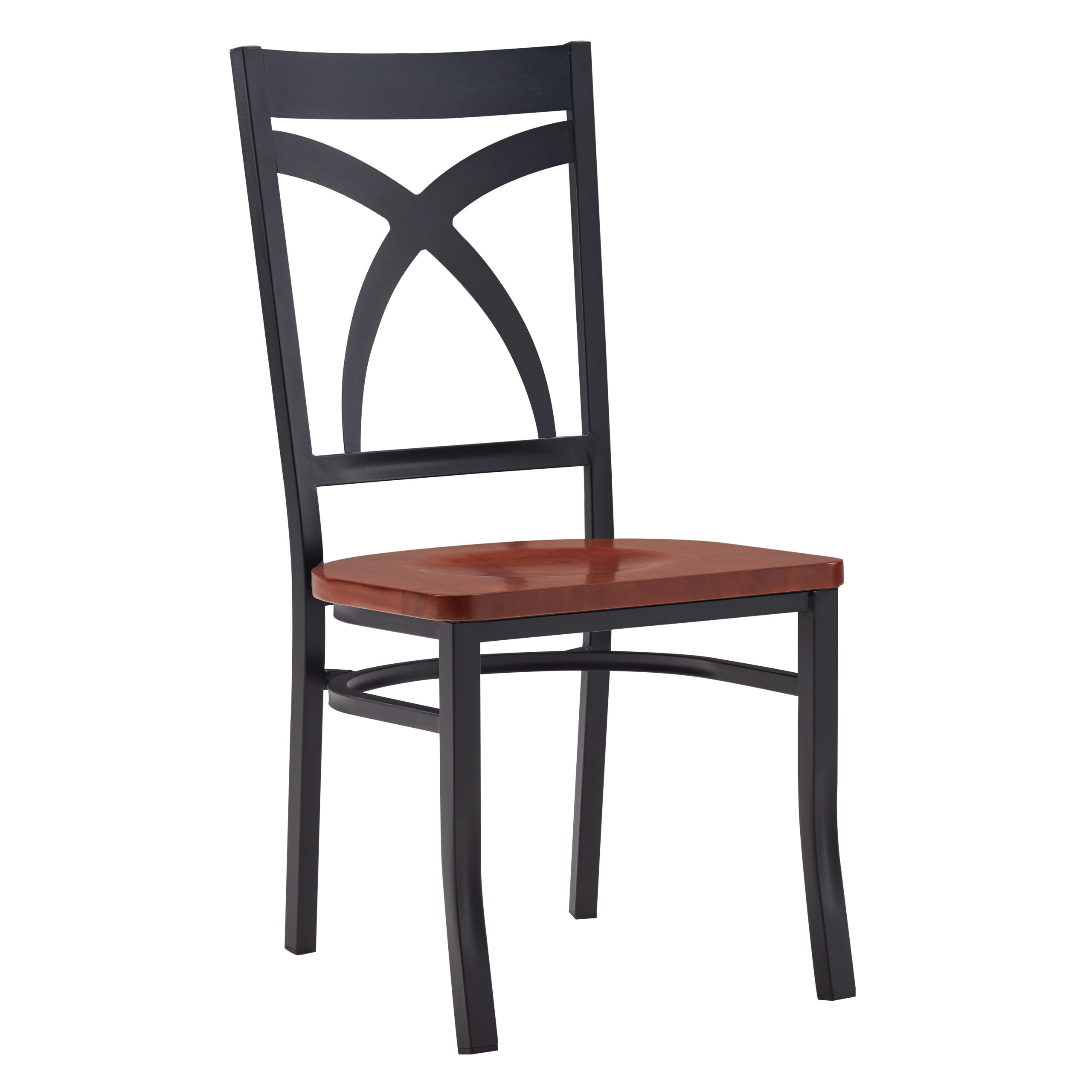 Finished in warm walnut tones, the square legs and circular metal brace provide added stability and visual appeal. For flexible use in tight spaces, the Drexel Chair is stackable for easy storage and movement.