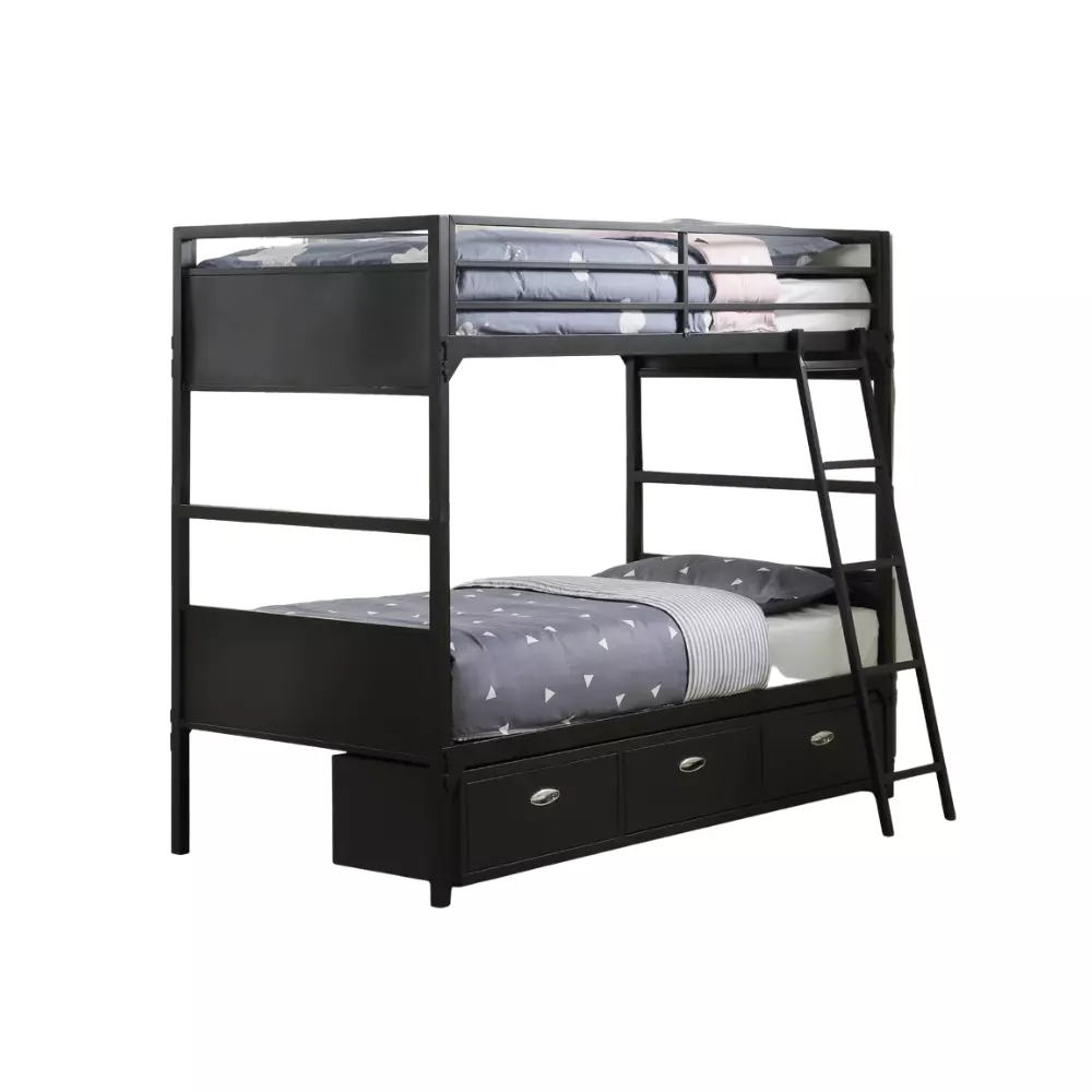 DETAILS – This Metal Bunk Bed is constructed of heavy duty steel for long-lasting simple functionality. The frame easily converts into 2 separate beds, and includes an iron guard rail and easy access ladder. The optional drawer adds storage on either side.
