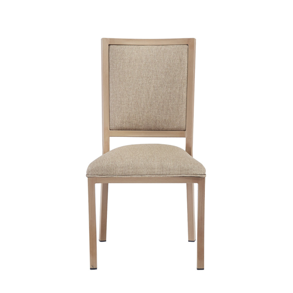 The Seabrook Metal Side Chair (Natural) is a robust and stylish seating option, featuring an industrial strength welded iron frame with a visually appealing natural water print finish. Its seat and back are upholstered in smooth brown vinyl, complemented by a comfortable foam fill and sturdy wood seat panel. Additionally, these chairs are stackable, offering both durability and space-saving convenience for various settings.