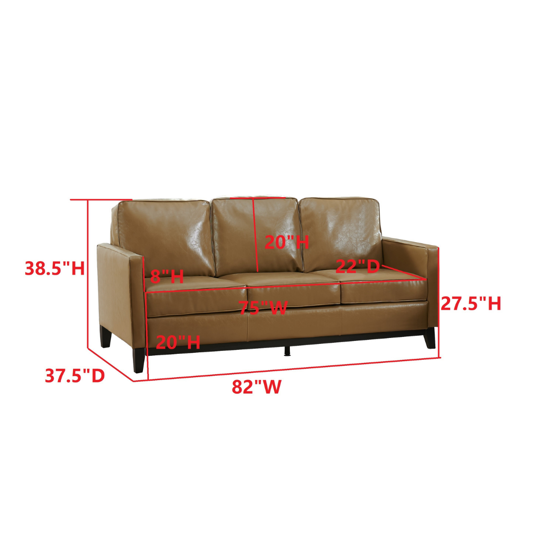 Our Soho Faux Leather Living Room Set is a harmonious blend of strength and coziness for any space. Its smooth vinyl upholstery exudes luxury, perfectly complemented by sturdy wood frames that ensures enduring support. The meticulously crafted design showcases a refined trim lining along the edges of the pieces, accentuating their classic appeal. With removable seat and back cushions, this living room set offers customizable relaxation, inviting you to sink into its plush comfort. Underneath each piece are four sleek black wood legs with an additional crossbeam for support.