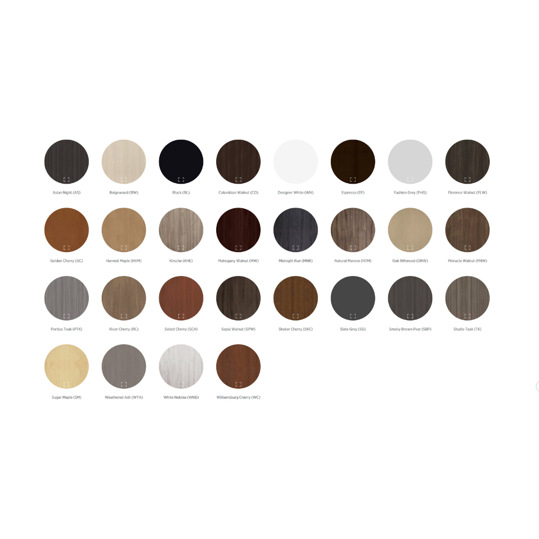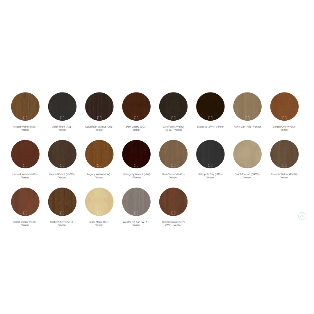 Tops: Veneer tops are 3/4” thick with veneer edge bands; made of select grade, sliced Black Walnut, Cherry, Maple, or