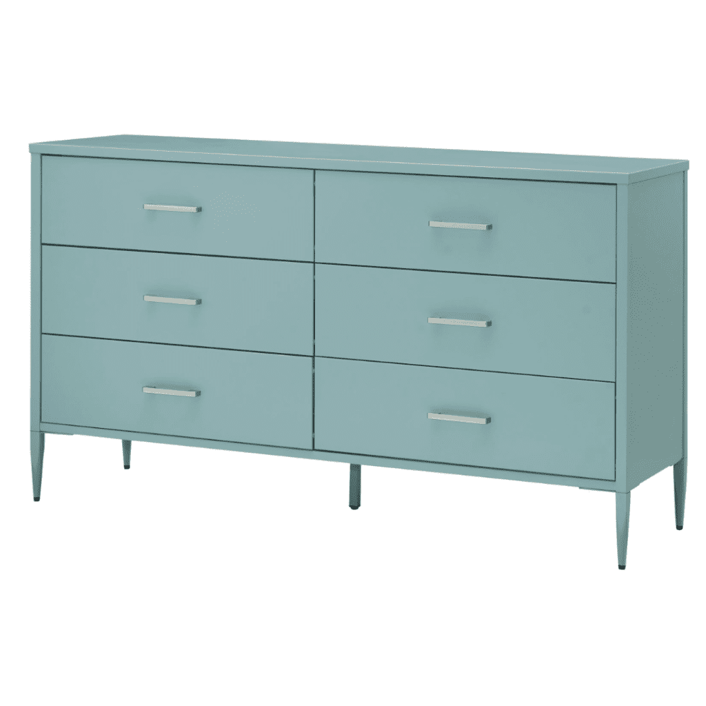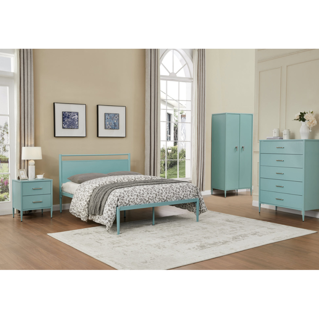 Check out the Tribeca Iron Bedroom Set, a robust set designed to complement both residential and commercial spaces. Constructed from resilient iron tube and adorned in a stunning turquoise finish, this bedroom set combines strength with style. The multiple drawers open smoothly with chrome metal handles and are available for spacious storage. Choose the perfect bed from a range of available sizes for a sturdy and visually appealing bed frame. The slat-style crossbars provide excellent mattress support, removing the necessity for a box spring. Plastic footpads below each piece ensure your floors remain scratch-free.